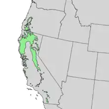 It is found from Lane County, Oregon, south through the Cascade Range, the Sierra Nevada, and the Coast, Transverse, and Peninsular Ranges to San Diego County, California. The tree occurs in pure or mixed stands. Pure stands usually indicate sites unfavorable to conifer growth or recurring disturbance such as fire or logging activities. The tree can grow in many types of soils, but they must be well-drained.[3][6][5]