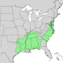 The species is most common in the American south and eastern states.[4] It can be found from Long Island Sound south to northern Florida, and west to southernmost Illinois, Missouri, Oklahoma, and eastern Texas.[5] Its natural range extends into southeastern Pennsylvania and southern New Jersey. It has also historically been recorded as occurring in Lancaster, Bucks, Chester, Delaware, and Philadelphia counties, chiefly on wet sites, occasionally in drier, upland ones.[6] Much of that area has been built over and developed since World War II, and the tree is now classified as endangered in the state.