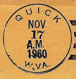 Quick is a small unincorporated community in Kanawha County, West Virginia, United States. It is located along Indian Creek Road (County Route 49).[2] The community is where Whitoak Fork and Blue Creek come together and meet. It is also where the abandoned railroad that follows Blue Creek joins the road, and follows it all the way to the community of Hitop, along Pond Fork. Its post office [3] is closed.