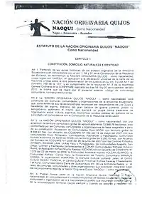 The Quijos-Quichua (Napo-Quichua) are a Lowland Quechua (Runa Shimi) people, living in the basins of the Napo, Aguarico, San Miguel, and Putumayo river basins of Ecuador and Peru. In Ecuador they inhabit in the Napo Alto as well as the rivers Ansuy and Jatun Yacu, where they are also known as Quijos Quechua. The Original Nation Quijos (NAOKI) has an extension of community territory of approximately 13,986, 78 hectares. It was recognized as such on March 13, 2013, by Codenpe (Council of Development of Nationalities and Peoples of Ecuador). Sus habitantes viven a lo largo del Alto Napo (Oriente ecuatoriano) y actualmente hablan el quichua, aunque su idioma original es el shillipanu. It is made up of dozens of groups, communities and organizations, according to their status.