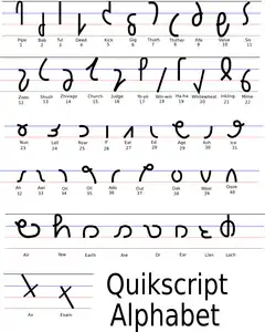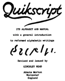 Quikscript (also known as the Read Alphabet[1] and Second Shaw) is an alphabet (and phonemic orthography) specifically designed for the English language. Quikscript replaces traditional English orthography, which uses the Latin alphabet, with completely new letters. It is phonemically regular, compact, and designed to be comfortably and quickly written. There are also Quikscript alphabets adapted for other languages, using the same letters for sounds which do not exist in English.