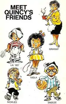 Quincy is an American syndicated newspaper comic strip published from July 13, 1970 to October 4, 1986, created and produced by cartoonist Ted Shearer.[1] The series, about an African-American boy being raised by his grandmother in Harlem, was one of the earliest mainstream comic strips to star an African American in the lead role, following Dateline: Danger! (1968-1974) and Luther (1969-1986). Another predecessor, Wee Pals (1965- ), features an African-American among an ensemble cast of different races and ethnicities.