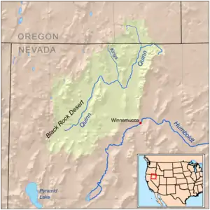 The Quinn River is the largest river in the region, starting in the Santa Rosa Range and ending in the Quinn River Sink on the playa south of the Black Rock Range. The watershed covers 11,600 sq mi (30,000 km2)[1] including the Upper and Lower Quinn River, Smoke Creek Desert, Massacre Lake, and Thousand Creek[3]/Virgin Valley[4] watersheds of northwestern Nevada as well as small parts across the borders of California and Oregon.