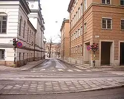 In contrast, the voluminous and heavy mass of Kanslihuset on the alley's eastern side, designed by Wolter Gahn and Gustaf Clason and completed in 1936, opens up to the alley in form of the western end of the series of courtyards which pierces the building.[2] The façade is decorated with a limestone frieze called Departementsfrisen (The Department Frieze") by Sig Blomberg.[3]