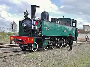 | E332 | Fives, Lille | 3587/1909 | 4-6-0T | RB 4-6-0 tank locomotive.[7] Weight 44.5 tonnes, boiler pressure 12 atm (180 psi).[9] Sold to the Blonay–Chamby Museum Railway, Switzerland in 1968, now preserved on the Chemin de fer de la Baie de Somme (CFBS).[10] | ![]() | |