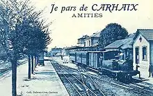 The 49-kilometre (30 mi) line from Carhaix to Morlaix opened on 28 September 1891.[4] Carhaix station was the headquarters of the RB. All five lines that made up the main RB system originated from Carhaix. The station is located to the east of the town. In common with many of the station on the RB, Carhaix was architecturally similar to may CF de l'Ouest stations.[5]