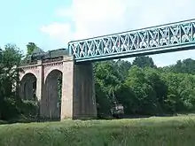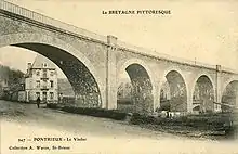 At Morlaix the line was shared with the CF de l'Ouest's standard gauge dual gauge line between Paris and Brest. A dual gauge section of track was laid on the up line on the viaduct across the harbour.[5] This was built by the CF de l'Ouest as part of their Paris - Brest line. The viaduct crossed the Chemins de fer armoricains (CFA) Morlaix - Plestin-les-Grèves line.[3] A platform at Morlaix was shared with the standard gauge.[5] A branch was opened on 12 February 1906 to serve the port at Morlaix. Freight traffic beyond Plougonver ceased from 25 September 1962.[3] The line between Carhaix and Morlaix closed completely on 9 April 1967.[6]