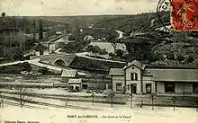 Saint Segal station 47.9 km (29.8 mi)) was followed by Port Launay 51.8 km (32.2 mi)), where the railway joined the Aulne, running along its east bank to Châteaulin Ville station 54.4 km (33.8 mi)), which was shared with the CF PO. Châteaulin Ville was on the CF PO Quimper - Landernau line. Leaving Châteaulin Ville, the RB line crossed the Aulne on a curving eleven-arch viaduct before Châteaulin Embranchement station 56.9 km (35.4 mi)) was reached. Here, the goods facilities were separated from the RB line by the standard gauge PO line.[5]
