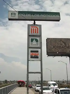 Río de los Remedios is a station on Line B of the Mexico City Metro system.[2][3] It is located on the Anillo Periférico and Boulevard Río de los Remedios in the Colonia Valle de Aragón 2a. Sección neighborhood of the Nezahualcóyotl municipality in Mexico State.[2]