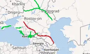 The Russian route R217, also known as the Caucasus Highway, is a trunk road that extends from Krasnodar to Chechnya and Dagestan, terminating at Russia's border with Azerbaijan. Its length is 1118 km. It forms part of European route E50.