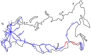 The Russian route R297 or the Amur Highway (so named after the nearby Amur River) is a federal highway in Russia, part of the Trans-Siberian Highway. With a length of 2,100 km (1,300 mi), it is the longest segment, from Chita to Khabarovsk, connecting the paved roads of Siberia with those of the Russian Far East.[1] The construction of the road united the Russian federal highways into a single system stretching from Saint Petersburg to Vladivostok. Before completion of the road, the Russian Pacific coast was connected to the rest of the country only by airlines, the Trans-Siberian Railway, and the Baikal–Amur Mainline.[2]