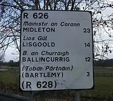 The R626 is a regional road in County Cork, Ireland. The route begins 1 km (0.62 mi) south of Rathcormac at its junction with the R639 and travels southeast for 23 km (14 mi) until it arrives at Midleton. The R626 is located entirely in County Cork.