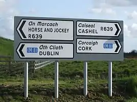 In the 17th, 18th and early to mid-19th centuries – and probably earlier still – horse-drawn Dublin-Cork traffic travelled via Kilcullen, Carlow, Kilkenny, Clonmel, Ardfinnan, Clogheen, Ballyporeen, Kilworth, Fermoy and Rathcormac. Much of the R639/N8 route was built to connect the midlands to southern Tipperary and north County Cork as part of the Irish turnpike road-building drive of the mid-18th century.[2] However, some sections are considerably older, such as the segment between Cork and Fermoy, and that between Cashel and Cahir; the construction of these particular stretches cannot as yet be dated, though they were in place prior to 1714.[3] The R639/N8 between Fermoy and Cahir via Mitchelstown was built sometime after 1811,[4][5] while the R639 between Cashel and Urlingford was built around 1739. At the same time, the route from Urlingford to Maryboro (modern-day Portlaoise) was substantially improved.[6] In 1782 an unnamed English tourist in Ireland, known to historians as "X.Z.", gave a brief description of the route between Cashel and Urlingford: "From Cashel we rode fifteen miles of a bad road, through a bleak country to Urlingford, when we enter Leinster province. The country now becomes more populous, better improved, and the roads much more agreeable for travelling."[7]