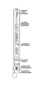The floats consist of 8 cm by 1.5 to 2.2 m long glass pipe that contain a hydrophone, signal processing circuits, a microprocessor, a clock and a battery. A float weighs about 10 kg. The lower end is sealed with a flat aluminium endplate where all electrical and mechanical penetrators are located. The glass thickness is about 5 mm, giving the float a theoretical maximum depth of about 2700 m. The external ballast is suspended by a short piece of wire chosen for its resistance to saltwater corrosion. By dissolving it electrolytically the 1 kg ballast is released and the float returns to the surface.[1]