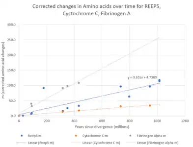 The evolutionary rate of the REEP5 protein is moderately high, falling between that of cytochrome c and fibrinogen alpha. Neutral mutations are expected to occur around once per one million years