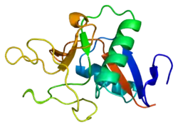 Pancreatic Stone Protein (PSP), also known as Lithostathine-1-alpha islet cells regeneration factor (ICRF) or islet of Langerhans regenerating protein (REG) is a protein that in humans is encoded by the REG1A gene as a single polypeptide of 144 amino acids further cleaved by trypsin to produced a 133 amino acid protein that is O-linked glycosylated on threonine 27. This protein is a type I subclass member of the Regenerating protein family. The Reg protein family is a multi protein family grouped into four subclasses, types I, II, III and IV based on the primary structures of the proteins.[4][5][6] Reg family members REG1B, REGL, PAP and this gene are tandemly clustered on chromosome 2p12 and may have arisen from the same ancestral gene by gene duplication.[6] The PSP is mostly produced in Human by the acinar cells of the pancreas and is secreted in the duodenum by the same pathway that pancreatic exocrine enzymes. It has C-terminal C-type lectin domain whose binding partner is currently unknown.
