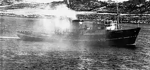 Typhoon saw service in the Falklands War from leaving the UK on 4 April 1982 until 20 July 1982 under Captain J N Morris with an all-civilian crew from Portland Naval Base.[6] She also carried 2 Royal Naval Personnel, 1 for comms and 1 medic, they had the distinction of being first to leave and returned home 24 September 1982 as did HMS Hydra docking in last that day 24 September 1982 in Portsmouth. Captain Morris and his civilian crew flew back from Port Stanley when Capt Stephens and the relief crew arrived in Port Stanley 20 July 1982. Under the command of Captain Bruce Stephens she returned to Portland with her new civilian crew. the 2 Royal Navy Crew remained on board until the vessel docked on 24 September 1982. She was the first ship – albeit a civilian vessel – to leave the UK ahead of the task force, and a member of the crew, the tugs bosun placed the Welsh flag on board RFA Sir Galahad just before Typhoon towed her out to sea to be scuttled by a submarine.[7] During the war, the ship was heavily involved in logistic duties, transferring fresh water to the task force at a rate of 18 tons per trip, and loading part of 17 Brigade onto the MV Norland in preparation for the San Carlos landings.[8] The ship was sold in 1989 and later converted into a trawler in 1992.[6]