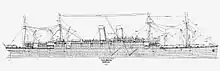 Propelled by two propellers powered by 2 4-cylinder triple expansion steam engines, the ship could sail at an average speed of 16 knots, and could reach a maximum speed of 18 knots. Her machines initially developed a power of 14 000 hp, which rose to 16 000 hp after an improvement was made to the machinery to allow the vessel to maintain the same speeds as her predecessors despite her larger size.[34] Her coal consumption was also slightly higher than that of the Celtic and the Cedric, at 280 tons per day instead of 260.[32] She was supplied with electricity and was provided with electric lights and refrigeration installations.[5]