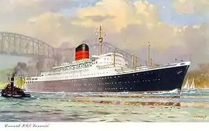 Prior to World War II, Cunard's Canadian services had been maintained by a group of six similar 14,000 GRT liners of the Andania class built between 1922 and 1925. One of these was a war loss and another four were purchased by the Admiralty during the war and converted to naval repair ships. None of these ever returned to commercial service. This left Cunard with one ship, Ascania from its pre war Canadian fleet. She was joined in the post war service by three of the surviving units of the 20,000 GRT Scythia class which had been built for the Liverpool-New York service. Of the four, only Ascania was able to reach Montreal, draught causing the others to turn around at Quebec. With this unsatisfactory situation and the age of the ships, it was inevitable that the decision to build would be taken and at the end of 1951 Cunard announced its intention to order two new ships for the Canadian service (the other two came later). Saxonia was launched on 17 February 1954 by Lady Churchill, wife of the then Prime Minister, and revived a name previously used for the Cunard liner RMS Saxonia, which had been launched in 1899 and scrapped in 1925. Completed early in August 1954, Saxonia arrived in Liverpool on the 23rd of that month and was prepared for her maiden voyage from Liverpool to Montreal which began on 2 September 1954.[3] She was joined by her sisters, Ivernia in July 1955, Carinthia in June 1956 and Sylvania in June 1957. The ship was refitted in 1962 and given another Cunard name from earlier in the century, Carmania. As Carmania, the vessel continued service on the Rotterdam - Le Havre - Southampton - Canada route for several years, and cruised in the Caribbean and Mediterranean in the winters.