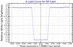 RR Caeli is a double star in the constellation Caelum. It is approximately 66 light years from Earth.[4] It was first noted to be a high-proper motion star in 1955 by Jacob Luyten, and given the name LFT 349. Discovered to be an eclipsing binary in 1979, it has a baseline magnitude of 14.36, dimming markedly every 7.2 hours for an interval of around 10 minutes, due to the total eclipse of the brighter star by the fainter one. Its variability in brightness led to its being given the variable star designation RR Caeli in 1984.[5] This star system consists of a red dwarf of spectral type M6 and a white dwarf that orbit each other every seven hours; the former is 18% as massive as the Sun, while the latter has 44% of the Sun's mass.[5] The red dwarf is tidally locked with the white dwarf, meaning it displays the same side to the heavier star.[6] The system is also a post-common-envelope binary, and the red dwarf star is transferring material onto the white dwarf. In approximately 9–20 billion years, RR Caeli will likely become a cataclysmic variable star due to the period's gradual shortening, leading to increasing rates of transfer of hydrogen to the surface of the white dwarf.[1] The white dwarf is likely to have a plain helium core, as its density is too low for the carbon-oxygen core.[2]