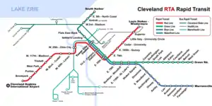 The RTA Rapid Transit system consists of a total of 47 stations.[10] The stations are fully or partially within the city limits of Cleveland, Shaker Heights, East Cleveland, and Brook Park.