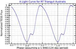 RT TrA varies between apparent magnitudes 9.4 and 10.2 over a period of 1.95 days. It was first discovered to be variable by Annie Jump Cannon in 1910 and initially classified as an RR Lyrae variable. Later authors segregated it and the similar V533 Centauri as RW Aurigae stars.[7] In time it became clear that RT TrA was unrelated to RW Aur, instead being a member of a group of stars on the instability strip somewhat above the horizontal branch.[8] These stars were then named as a group after BL Herculis, the brightest known member.[9] BL Her stars have periods shorter than eight days.[3] Like other BL Her variables, the light curve of RT TrA has a hump, in this case on the descending branch. The light curve is slightly asymmetric, with the minimum occurring at phase 0.6.[6]