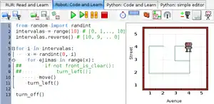 RUR - Python Learning Environment (RUR-PLE) is an educational tool to help students learn the Python programming language. Made by André Roberge. RUR-PLE uses the idea behind Karel the Robot, making the learning of Python programming more interesting. A student writes a program that controls a 'robot' that moves through a city consisting of a rectangular grid of streets (left-right) and avenues (up-down).