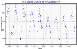 R Capricorni (R Cap) is a star in the constellation of Capricornus.[2] It has an apparent visual magnitude which varies between 9.4 and 14.9.[3] A mira variable and ageing red giant, it is in the asymptotic giant branch stage of its lifespan.[4]