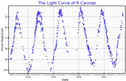 R Carinae is a double star in the southern constellation of Carina. The brighter component is a variable star that can be viewed with the naked eye at peak brightness,[9] but is usually too faint to be seen without a telescope, having an apparent visual magnitude that fluctuates around 7.43.[6] This star is located at a distance of approximately 1,300 light years from the Sun based on parallax, and is drifting further away with a radial velocity of +28 km/s.[6]