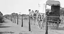 Alexander Crawford took over the maintenance of the fence from Anketell as each section was finished and remained in charge until he retired in 1922.[4] The area inside the fence to the west became known as "Crawford's Paddock". The fence was maintained at first by boundary riders riding bicycles and later by riders astride camels. However, fence inspection was difficult from atop the tall animal. In 1910, a car was bought for fence inspection, but it was subject to punctured tyres. It was found the best way to inspect the fence was using buckboard buggies, pulled by two camels.