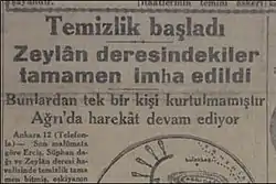 The Zilan massacre of 1930[38][39][40] was a massacre[41][42] of the Kurdish residents of Turkey during the Ararat rebellion in which 800–1500 armed men participated.[43] According to the daily Cumhuriyet dated July 16, 1930, about 15,000 people were killed and Zilan River was filled with dead bodies as far as its mouth.[44][45][46][47] On August 31, 1930, the daily Milliyet published the declaration of the Turkish prime minister İsmet İnönü: "Only the Turkish nation has the right to demand ethnic and racial rights in this country. Any other element does not have such a right.[48][49] They are Eastern Turkish who were deceived by unfounded propaganda and eventually lost their way."[50]