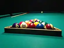 A rack (sometimes called a triangle) is a piece of equipment that is used to place billiard balls in their starting positions at the beginning of a pocket billiards game. Rack may also be used as a verb to describe the act of setting billiard balls in their starting positions (e.g. "to rack the balls"), or as a noun to describe a set of balls that are in their starting positions (e.g. "a rack of balls", more often called a pack or a pyramid in British English).
