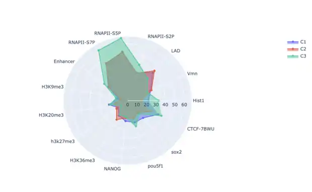 This specific radar chart was derived from three clusters of nuclear profiles in the Hist1 region of the human genome. To read more about the process used to gather the nuclear profiles being used for clustering, please reach genome architecture mapping. The traits being studied in this Radar Chart are on the outside of the circle of the figure above. There are three different shapes in the Radar Chart which correspond to the three different clusters. The first cluster is blue, the second cluster is red, and the last cluster is green. The individual radar charts have been provided in Figure 7,8, and 9 respectively. The values displayed are the average values of each trait in each cluster ranging from 0 -70%. The shapes of the cluster radar charts can provide a general idea of which clusters are similar and which clusters are dissimilar. Clusters two and three have similar shapes and have a very similar percentage of genomic windows that have the LAD trait. Cluster one has a much higher percentage of genomic windows with RNAPII-S5P and RNAPII- S7P compared to the other clusters. It is known that the Hist1 and LAD trait should have an inverse relationship. In the chart we can see that while C1 and C2 have an approximate 40% LAD trait percentage the LAD trait in C3 is lower with an approximate 31% LAD percentage. The C1 cluster has a higher Hist1 percentage than the other clusters. These observations show how using radar charts can be used to reinforce or deny beliefs one has about the data being studied. The initial thought on the relationship between Hist1 and LAD was reinforced by comparing the radar charts. Another insight we can derive is how all the clusters seem to have higher percentages of the RNAPII-S5P traits. All the clusters have this trait at a percentage over 50%. The cluster traits of H3K9me3 and h3k27me3 which are very low in each of the clusters. This information helps us identify the highest and lowest performing traits in the clusters.