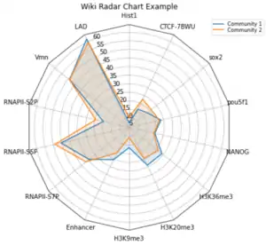 Figure 5.  The radar chart shows 2 sets of communities (see also Community Structure) that consist of connected genomic windows which see the same NP (the names of the spokes within the pentagram). In a visual analysis, we can determine that the two communities are close in that they see similar amounts of the given NP's. The data points are represented as a percentage of the community that see the NP.