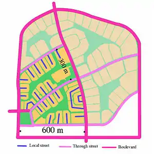 The design is typified by the backyards of homes facing the street and the fronts of homes facing one another, over common yards.[1][2] It is an offshoot of American designs from the English 'garden city' movement and culminated in the design of the partly-built 1929 Radburn estate.[3]