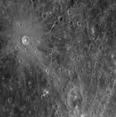 ![]() MESSENGER image. Raden Saleh is the crater with bright rays in upper left. | |