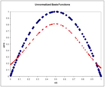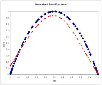 Figure 9: Normalized basis functions. The Logistic map (blue) and the approximation to the logistic map (red) as a function of time. Note that the approximation is good for only a few time steps. This is a general characteristic of chaotic time series.