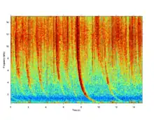 A radio atmospheric signal or sferic (sometimes also spelled "spheric") is a broadband electromagnetic impulse that occurs as a result of natural atmospheric lightning discharges. Sferics may propagate from their lightning source without major attenuation in the Earth–ionosphere waveguide, and can be received thousands of kilometres from their source. On a time-domain plot, a sferic may appear as a single high-amplitude spike in the time-domain data. On a spectrogram, a sferic appears as a vertical stripe (reflecting its broadband and impulsive nature) that may extend from a few kHz to several tens of kHz, depending on atmospheric conditions.