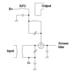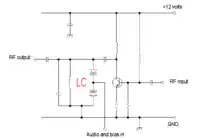 ![]() This single ended amplifier uses a narrowly tuned anode circuit to reduce harmonics when operating class AB or C. |