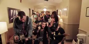 It was announced on 11 August that the band would be shooting a music video for the single.[18] The band sent out a casting call to fans to appear as extras on the shoot.[19] The video was directed by Meiert Avis,[20] and shot at the Linda Vista Hospital in Los Angeles.[21] The video is set in a hotel, and has been described as a direct homage to the Ramones video for their 1981 single "I Wanna Be Sedated."[22][23][24] The video begins with New Found Glory sitting on a bed in an empty hotel hallway, before a slew of characters emerge in the background.[23] To create this chaotic party scene, a mixture of fans and close friends of the band were called in and assigned random costumes.[21] The director gave several actions for each extra to perform and after each take, people were able to get "more and more into character".[21] Over 100 extras were used during the shoot,[22] portraying characters such as fire breathers, cheerleaders, and convicted felons amongst others.[23] There are also several parodies of celebrities, including those of Lady Gaga, Bill Clinton, and Barack Obama parading around in the background. Tom Denney, former A Day To Remember guitarist, also appears in the video.[23]