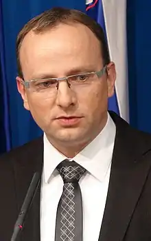 Radovan Žerjav (born 2 December 1968) is a Slovenian conservative politician. Between 2007 and 2008 he served as Minister of Transport. During the second term under Janez Janša, he in 2012 served as Minister of Economic Development and Technology, which he left since Janša was ignoring the 2012–2013 Investigation Report on the parliamentary parties' leaders by Commission for the Prevention of Corruption of the Republic of Slovenia.[1][2][3] Since 2009, he has been the Chairman of the Slovenian People's Party and a deputy in the National Assembly.