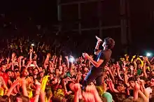 Notable bands that have visited the fest in the past are Parikrama, Silk Route, Whitenoiz[8] and Motherjane along with tribute bands like Higher-on-maiden, Breathe the Floyd and Jail break. In 2011, Ragam witnessed a breathtaking performance by the 'Jai Ho' team. In 2009 Ragam became the first stage in Kerala to host a foreign band, with Breathe the Floyd, a tribute band to Pink Floyd. In 2015 Ragam truly went international, with Swiss folk metal band Eluveitie performing for the 'nite'. Sunburn Campus featuring DJ Diego Miranda for the first time in India took Ragam to new heights.