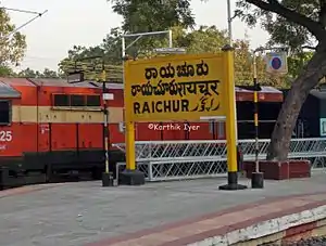 Raichur Junction railway station (station code:RC[1]), is located in Raichur district in the Indian state of Karnataka and serves Raichur and the surrounding industrially efflorescent area. The station has three platforms.