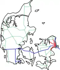 The rail transport system in Denmark consists of 2,633 km of railway lines,[5] of which the Copenhagen S-train network, the main line Helsingør-Copenhagen-Padborg (at the German border), and the Lunderskov-Esbjerg line are electrified. Most traffic is passenger trains,[6] although there is considerable transit goods traffic between Sweden and Germany.