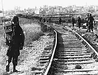 The railways saw significant use in the Second World War.[9] The British originally planned to connect their standard-gauge network from Haifa to Riyaq but gave up the project in 1941 as too difficult.[12] Instead, engineers from South Africa and Australia completed a standard-gauge line along the coast between Haifa and Beirut by 24 August 1942 and expanded this to Tripoli Railway Station by 18 December 1942.[12][21] This Haifa–Beirut–Tripoli Railway (HBT) was the last link connecting the European and North African standard-gauge rail networks,[7] apart from the ferry across the Bosphorus at Istanbul, but it never operated for civilian use. Instead, the British maintained it under the control of their military as late as February 1948, when the Jewish insurgency in Palestine destroyed the bridges near the tunnels at Ras al-Nakura. An earlier attempt by Haganah forces to attack the HBT in two places near Nahal Kziv during the Night of the Bridges in 1946 was unsuccessful. Nowadays the only portion of the HBT still in operation is the Coastal Railway between Nahariya and Haifa in northern Israel.
