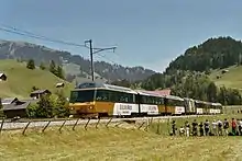 The Chemin de Fer Montreux Oberland Bernois (MOB) line runs 75 kilometres from Montreux on Lake Geneva to Zweisimmen, with a connecting line to Lenk in the Simmental. The section from Montreux to Zweisimmen, approximately 63 kilometres long, is part of the "Golden Pass Panorama" trip from Montreux to Lucerne, a trip which combines rides on the MOB, the BLS and the Zentralbahn (zb).[7][12]