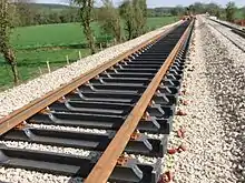 Bi-block (or twinblock) ties consist of two concrete rail supports joined by a steel bar. Advantages include increased lateral resistance and lower weight than monobloc concrete ties, as well as elimination of damage from torsional forces on the ties center due to the more flexible steel connections.[38] This tie type is in common use in France,[39] and are used on the high-speed TGV lines.[40] Bi-block ties are also used in ballastless track systems.[39] They are gauge-convertible by cutting and welding the steel bar to the dimension that suits the new gauge.