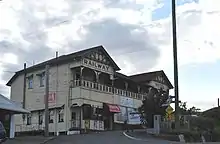 A prominent landmark standing on one of Gympie's hilltops, the Railway Hotel is a two-storeyed timber building on the corner of Station Road and Tozer Lane, Gympie. From this elevated site, adjacent to the former Gympie railway station, the hotel affords expansive views across Gympie and surrounding districts. A timber footbridge connects the hotel and the railway station.[1]