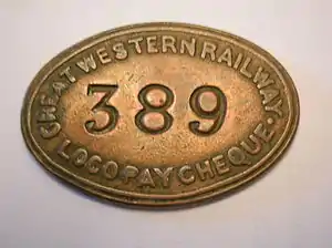 The one-sided identification cheques were usually drawn from the wages office on a Thursday, prior to the Friday payday. The cheques would then be exchanged for a payslip, and the wages paid on signature.[1] In many cases where pay cheques were in use they were often issued to each employee at the start of his employment and retained for the rest of the person's working life with the company.[2] Specialised trays were used for storing these cheques.[3] Stores, maintenance and other departments used this 'pay cheque' system. British Railways examples exist, however it is not at present recorded when their use ceased.[4]