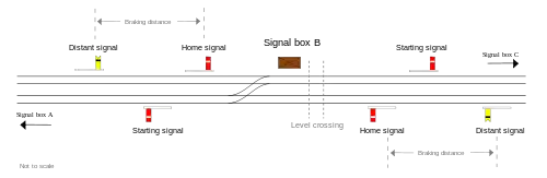A particular signal box may control one or more stop signals on each running line. In a traditional mechanically signalled area in the United Kingdom, it is most common for a signal box to have two stop signals governing each line. The first reached by a train is known as the home signal. The last stop signal, known as the starting or section signal, is usually located past the points etc. and controls entry to the block section ahead. The distance between the home and starting signals is usually quite short (typically a few hundred yards), and allows a train to wait for the section ahead of it to clear without blocking the line all the way back to the previous section.